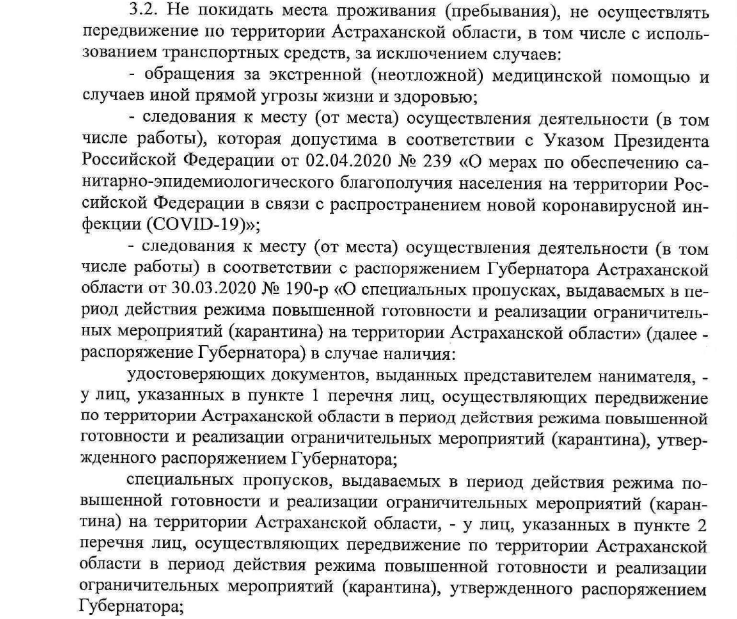 Гаишник объяснил, что действует на основании Постановления Правительства Астраханской области №140 от 4 апреля 2020 года. Патрульный, видимо имел в виду пункт 3.2 этого распоряжения.