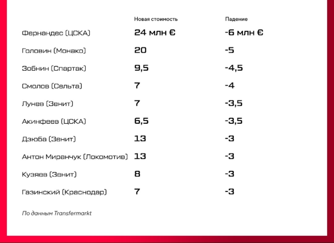Здесь не все так драматично. • Марио Фернандес остается самым дорогим российским игроком, и если бы не вирус, его стоимость бы не изменилась. Защитник ЦСКА держит планку. У Головина и Дзюбы – такая же история. • А вот Федор Смолов, несмотря на переезд в «Сельту» и гол «Реалу», потерял около 35%. • Роман Зобнин после травмы пока не вышел на топ-уровень и поэтому подешевел на 4,5 млн (более 30%). Но ему только 26, за летние туры это падение вполне можно поправить. Кто и как высчитывает стоимость игроков? Кратко: Transfermark собирает мнения пользователей и выводит среднюю цифру. А вот подробное объяснение от российского представителя компании Артема Заводника. «На форуме Transfermarkt 3-4 раза в год обсуждают ценники футболистов – 1-2 раза оцениваем игроков выборочно и два раза в год обновляем все ценники. Юзеры предлагают свои версии.