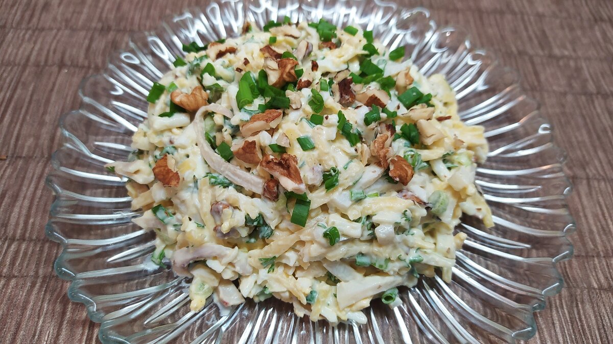 Очень люблю этот салат с кальмарами и могу его есть хоть каждый день - очень вкусный и не надоедает.
