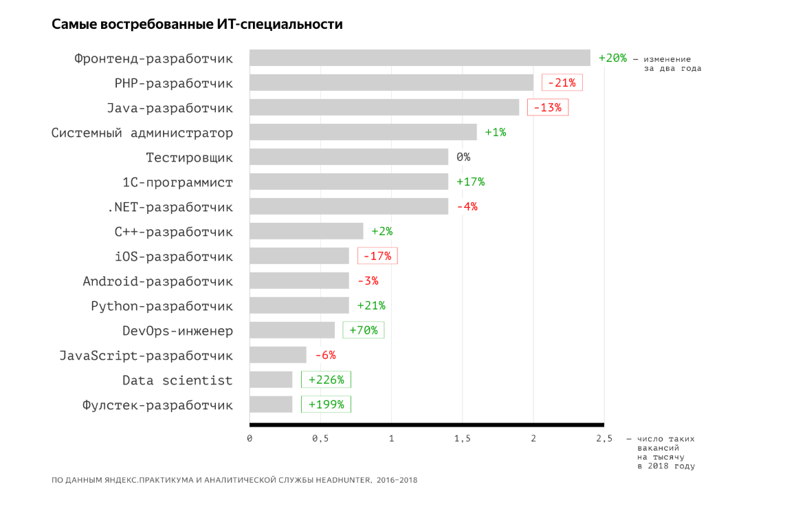 Данная статья будет интересна всем, кто выбирает себе профессию или тем, кто хочет переучится на другую, более прибыльную и перспективную. 1. Разработчик ПО. Зарплата: 84.797руб. 2. Продажи лекарственных препаратов. Зарплата: 71.416руб. 3. Специалист по продажам. Зарплата: 65.509руб. 4.Проектирование. Зарплата: 62 943руб. 5. Продажи финансовых и банковских продуктов. Зарплата: 58.185руб. 6. Эксплуатация информационных систем. Зарплата: 57.828руб. 7. Юридическая поддержка. Зарплата: 55 529руб. 8. Дизайн, верстка, иллюстрация. Зарплата: 54.873руб. 9. Девелопмент. Зарплата: 54 348руб. 10. Управление транспортными средствами, техникой и машинами. Зарплата: 41.632руб. Если вы живете в крупных городах миллионниках, то можете добавить к этим цифрам 30-50%. Если вы думаете какое образование получать, то рекомендую присмотреться к этим трем направлениям деятельности. 1. Информационные и компьютерные технологии Из ТОП-10 высокооплачиваемых вакансий, 3 относятся к сфере информационных тех