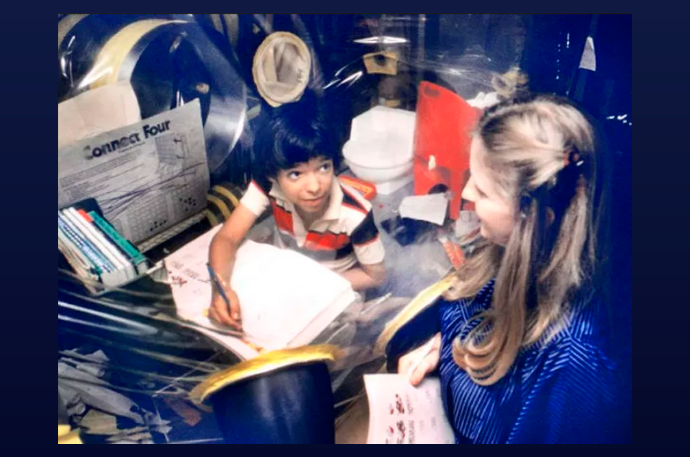 В 7 лет Дэвид Филипп Веттер начал изучать школьную программу. Он либо учился по телефону, либо к нему на дом приходили репетиторы. У Дэвида были друзья-сверстники, которые часто оставались у него дома даже с ночевкой, когда Дэвид жил дома. Они обожали фильм «Звездные войны». Однажды один из приятелей даже организовал для Дэвида показ «Возвращение Джедая» в кинотеатре. Дэвид добрался туда в своем транспортном пузыре. Часть 1 - Долгожданный наследник Часть 2 - Эксперимент Часть 3 - Coca-Cola и Король Микробов Часть 4 - Первая высадка на "Землю" Когда Дэвиду исполнилось 8 лет, врачи рассказали ему горькую правду. Может потребоваться еще 10 лет на изобретение лекарства от его болезни. Значит ему придется жить в пузыре до зрелого возраста. Работники больницы рассказывали, что у мальчика часто происходили вспышки неконтролируемого гнева и истерика. Он кричал, что его заключили в клетку как животное. Однажды Дэвид спросил своего психолога Мэри: «Почему я так зол все время? Я вижу мир в ок