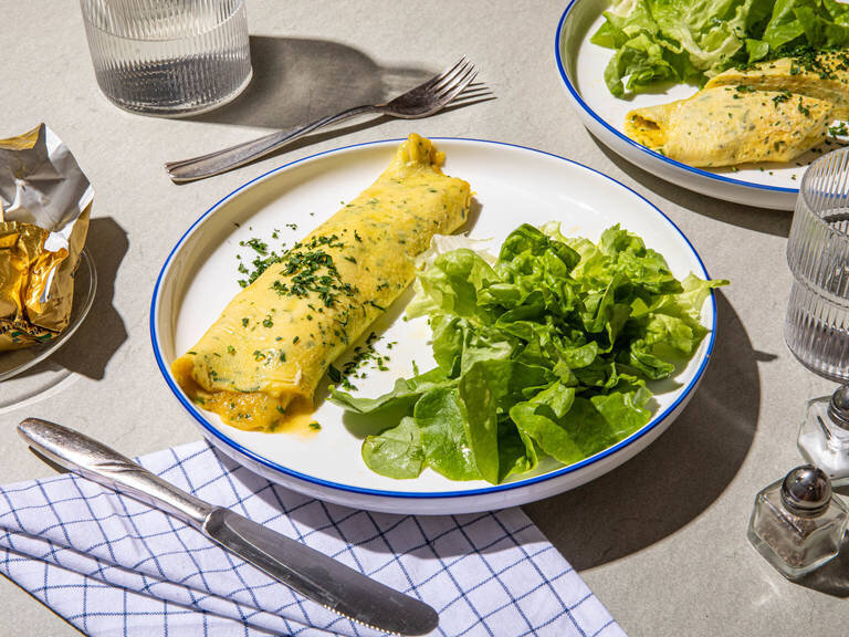 Ингредиенты Порции: 2 3 яйца 10 г смешанных трав 30 г сыра Грюйер 2 ст. л. несоленого сливочного масла Шаг 1/3 10 г смешанных трав-30 г сыра Грюйер-3 яйца-морская соль Тонко нарежьте зелень. Натереть сыр. Взбейте яйца до тех пор, пока белки полностью не соединятся. Приправьте щепоткой соли. Шаг 2/3 2 ст. л. несоленого сливочного масла Растопите сливочное масло в антипригарной сковороде на среднем огне. Добавьте яйца и половину зелени. Используйте лопаточку или палочки для еды, для того чтобы отделить яйца, проводя ими по краю кастрюли. Прекратите отделять яйца от стенок, когда увидите что снизу яйцо поджарилось а сверху оно остается немного жидким Шаг 3/3 Разбросайте сыр по яйцам. Если смесь выглядит слишком жидкой, дайте ей постоять 20 секунд, затем поднимите противоположный край лопаточкой и слегка переверните ее. Аккуратно переложите на тарелку и украсьте большим количеством зелени и сливочного масла, если хотите. Наслаждайтесь! Не забывайте подписаться на канал)