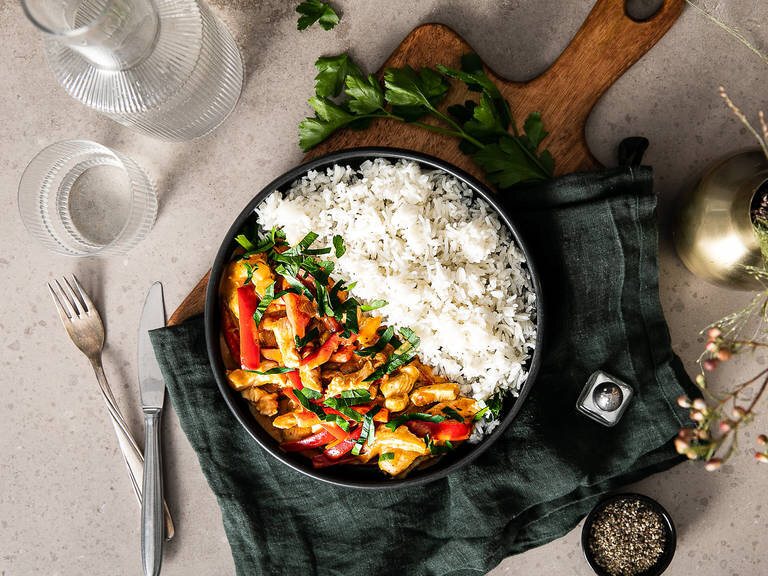 Ингредиенты Порции: 2 250 г грудки индейки 1 красный болгарский перец 120 г риса басмати 1 луковица 1 веточка петрушки 1 ст. л. муки ½ Ч. л. сладкого порошка паприки ½ Ч. л. горячего порошка паприки 150 мл куриного бульона 100 мл густых сливок 1 ст. л. соевого соуса ¼ Чайной ложки сахара 1 ч. л. Айвара Шаг 1/4 1 луковица-1 красный болгарский перец-1 веточка петрушки-250 г грудки индейки-120 г риса басмати Лук очистить и мелко нарезать. Перец вымыть и нарезать соломкой. Мелко нарежьте петрушку. Нарежьте грудку индейки полосками. Приготовьте рис басмати в соответствии с инструкцией по упаковке. Шаг 2/4 соль-перец-растительное масло (для жарки) Разогрейте растительное масло в большой сковороде и добавьте индейку. Дайте повариться до золотистого цвета 2-3 мин. Выньте индейку из кастрюли, посолите, поперчите и отложите в сторону. Шаг 3/4 1 столовая ложка муки-чайная ложка сладкого порошка паприки-1 чайная ложка острого порошка паприки-150 мл куриного бульона-100 мл жирных сливок Добавить