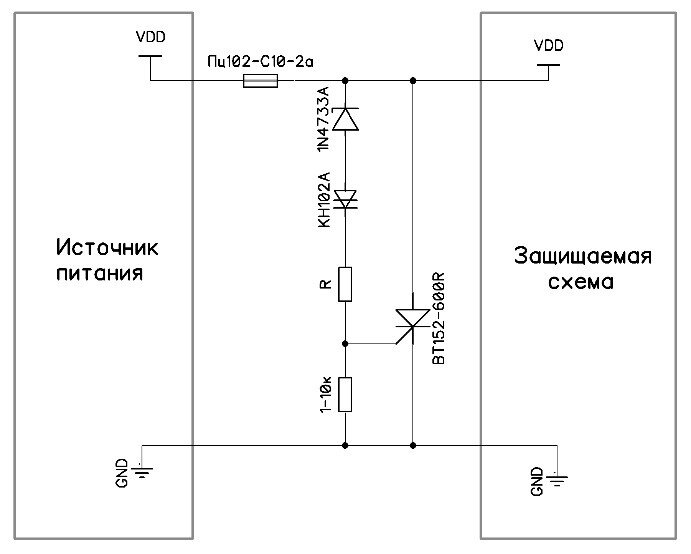 Как-то мой приятель, радиолюбитель пожаловался на то, что повышенное напряжение, ошибочно поданное на его схему, спалило дорогие элементы, а предохранитель, который тоже был на месте, остался целым. Исключительно в целях сочувствия моему приятелю, я предложил ему защитную цепь, исключающую эту несправедливость. Не Бог весть что, но моему приятелю понравилось.
