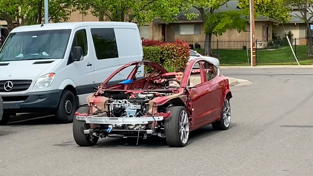 Мы понятия не имеем, что случилось с этим электрокаром, но похоже, авария была знатная. Tesla Model 3 этого года выпуска выглядит так, будто убита в «тотал», тем не менее вполне уверенно перемещается своим ходом – насколько это возможно с полностью раскуроченным кузовом.