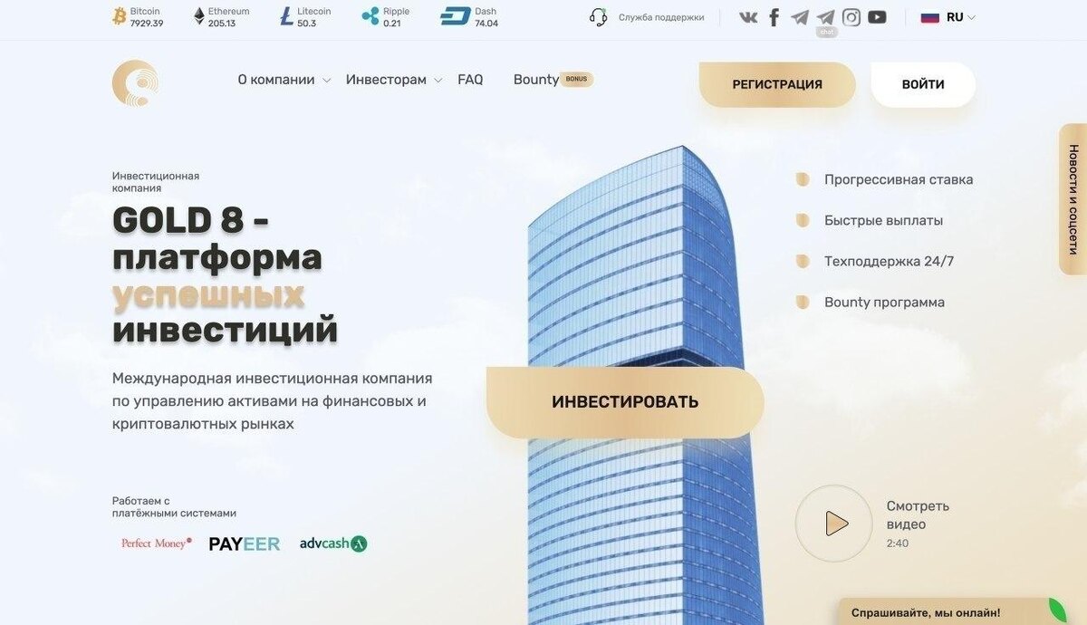 ℹ️ Gold8 Limited — международная финансовая компания, зарегистрированная в Гонконге, осуществляющая инвестиционную деятельность, связанную с торговлей на финансовых и криптовалютных рынках опытными управляющими. Предлагает стабильную прибыль 2-3.5% в день по бизнес-дням на протяжении года!
