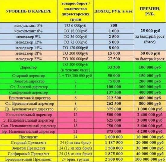 Различают 8 видов заработка в конкретной компании: 1. Экономия на покупках Покупая в собственном интернет-магазине, вы получаете не только скидку от компании на продукты дополнительно к скидке в каталоге от 20 до 90%, но и пользуетесь качественной продукцией по выгодной цене. Зарегистрированные пользователи могут принимать дополнительно участие во множестве параллельных акций. 2. Немедленная прибыль Предлагая и продавая продукцию другим людям, вы зарабатываете немедленную прибыль в размере разницы между себестоимостью продукта для вас, как зарегистрированного пользователя, и ценой в каталоге. Есть возможность получать продукты с 50% скидкой. 3. Возврат от 3 до 22% от личных объемов покупок Всего начальных уровней 7: 3%, 6%, 9%, 12%,15%, 18%, 22%. На каждом есть свои преимущества. На данный момент компания делает бонус, и все получают повышенный процент. В рублях это примерно составляет от 800 до 2 500 000 рублей каждые 3 недели. 4. Возврат от 3 до 22% от группового товарооборота Анало