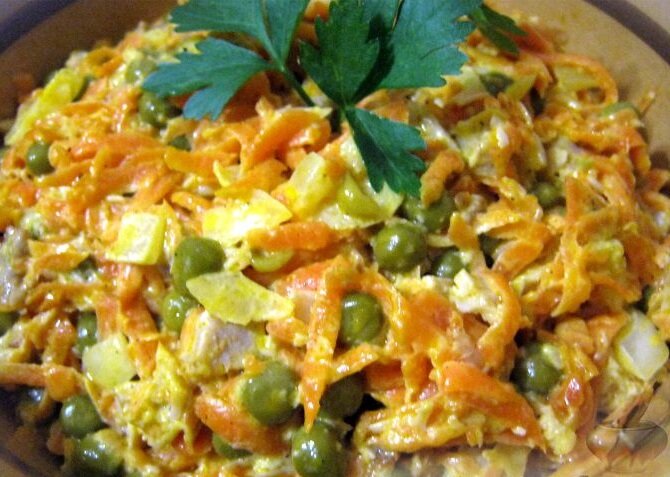 Привет всем у нас сегодня очень вкусный салат с отварным мясом майонезом и овощами. Украсит ваш стол в любой праздник . И так, нам понадобиться : - Майонез -3 ст. л, -Соль , перец по вкусу, -Растительное масло для жарки - 5 ст. ложек. -Свинина -300 гр. -Морковь - 2 шт. Лук репчатый - 1 шт. -Сахар - 1 ст. ложка. -Уксус - 1 ст. ложка -Горох зелёный консервированный - 150-200 гр. И так начнем , мясо отвариваем на мелком огне под крышкой "готовиться около часа" затем охладите . Морковь натираем на терке Репчатый лук чистим и нарезаем кубиками Далее разогреваем сковороду, наливаем растительное масло. Морковь выкладываем и обжариваем на среднем огне, помешивая 4 минуты , далее охлаждаем. Лук солим, добавляем сахар, поливаем уксусом. Хорошо перемешиваем руками и оставляем мариноваться минут на 7-10. Охлажденное мясо и нарезаем кубиками . Все ингредиенты складываем в тарелочку . Далее все это дело солим , перчим , добавляем майонез и хорошо перемешиваем . Блюдо готово ! Приятного ап