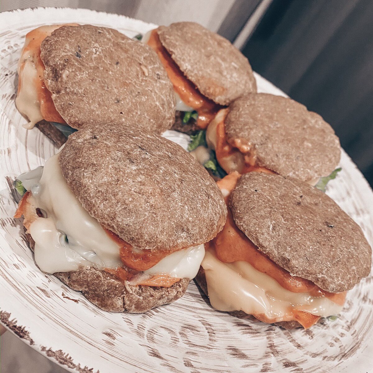 Сидишь на диете,но скучаешь по бургерам? Тогда у меня для тебя есть рецепт пп бургера! Ингредиенты: ▪️для теста Яйцо 1 шт Ц/з мука (сколько возьмёт) Вода 1 стакан Кефир 1/2 стакана Оливковое масло 1 ст л Соль Прованские травы ▪️для соуса Томатная паста Сметана Чеснок Соль ▪️для начинки Фарш с одной грудки Помидор Сыр Лист салата Лук красный Приготовление: Замешиваем тесто со стандарту. Формируем будущие булочки ,кладём на пергаменную бумагу. Отправляем в духовку на минут 7-10. Температура 150. Следующими идут котлеты (делаем плоскими). Запекаем минут 12 при 180*. Остывшие булочки разрезаем на 2 части. Каждую внутри смазываем соусом(смешиваем в одинаковой пропорции сметану,томат,давим чеснок,солим). На нижнюю булочку выкладываем начинку в таком порядке: помидор, красный лук,котлета, лист салата ,сыр, булка. Чтобы сыр растаял можно поставить ещё на 2 минуты в духовку 😋 Выходит около 5-6 чизов. Приятного аппетита, мои хорошие! 💋