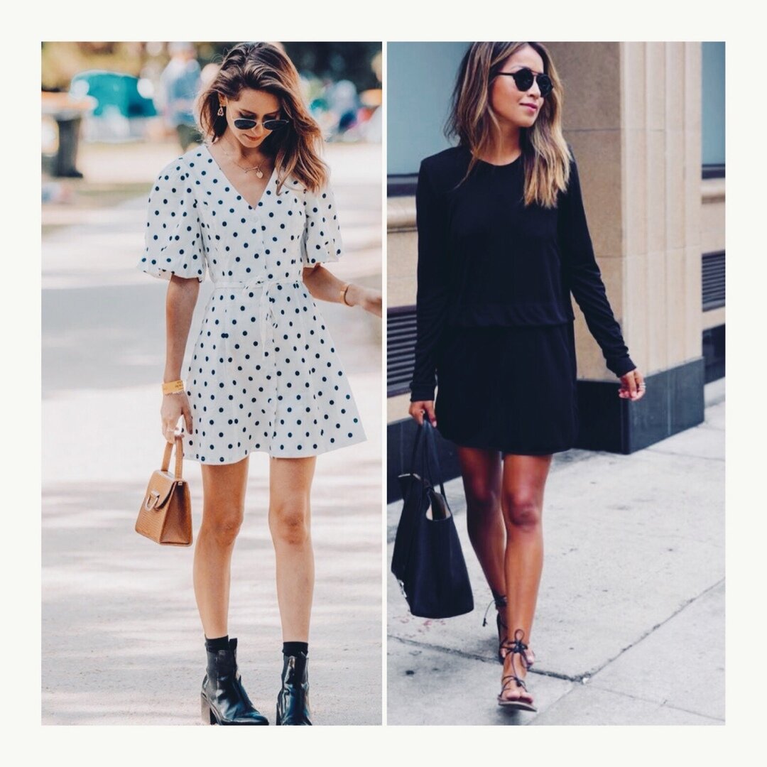 Монохромный образ в черном цвете - это стильный выбор для любого случая. Черное мини-платье лучше выбирать с закрытым вырезом, чтобы образ был сбалансированным. Летом можно носить их с сандалиями на плоской подошве.