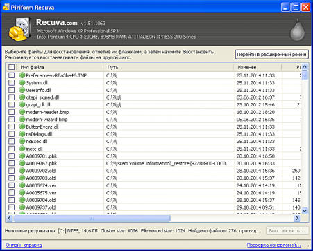 После нажимаете «начать и программа »найдет все файлы которые были удалены.Программа также помечает цвет те файлы которые можно восстановить практически со 100% вероятностью и те файлы которые будет восстановить затруднительно. После всех манипуляций выбираете файл или все файлы через нажатие правой кнопки мыши выбираете пункт «восстановить выделенные».