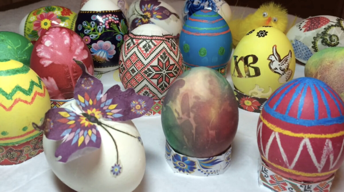 Существует много технологий покраски Пасхальных яиц. Делюсь своими секретами, как красиво покрасить яйца к Пасхе. Вариант 1. Украшение яиц с помощью восковых карандашей Совет: чтобы тёплое (горячее) яйцо не обжигало вам пальцы, положите салфетку на ладонь, а затем яйцо. Вариант 2. Декупаж Пасхальных яиц Вариант 3. Мраморный рисунок на Пасхальных яйцах Вариант 4. Украшение с помощью зелени и капрона Пошаговое видео всех вариантов оформления Пасхальных яиц можно посмотреть по ссылке: https://youtu.be/xM2fT8MZKts