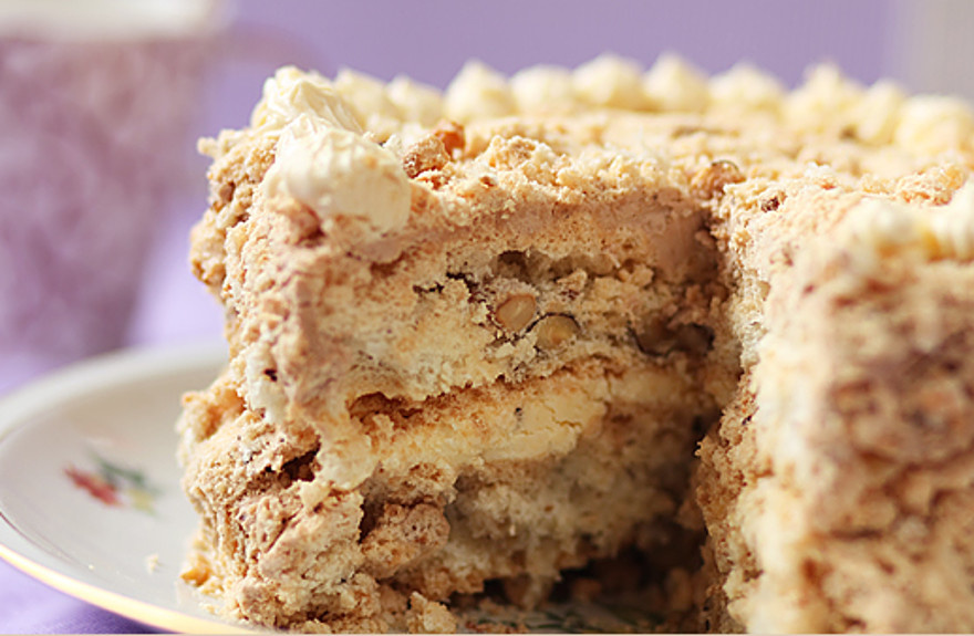 Ингредиенты: 1. В первый день подготавливаем, то есть «заквашиваем» белки. Для этого отделяем белки от желтков и помещаем их в отдельную посуду. Подготовленные белки накрываем крышкой или пищевой пленкой и оставляем при комнатной температуре на сутки. За это время на поверхности белков образуются пузыри, которые и придают коржам неповторимую воздушность. 2. На второй день занимаемся выпечкой коржей. Для этого подготовим сухую ореховую смесь. Орехи немного обжариваем на сухой сковороде до золотистого цвета и измельчаем ножом или скалкой. Если орешки уже поджаренные, то первую процедуру пропускаем. 3. Добавляем к орехам муку, 250г сахара и перемешиваем. 4. Заквашенные белки взбиваем до пены и не останавливая обороты миксера, вводим 100 г сахара. Тщательно взбиваем до густой пены. 5. В белковую смесь порционно добавляем нашу сухую смесь и аккуратно ложкой или лопаткой вымешиваем тесто. 6. Возьмите 2 формы. Дно каждой из них устелите пергаментом и немного смажьте сливочным масл
