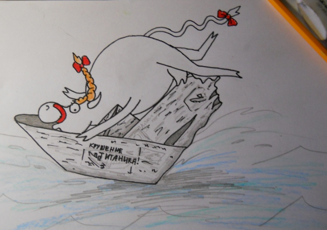Муся вприпрыжку помчалась в сарай, набрала кипы старых газет и принялась за дело. Через несколько минут перед ней на волнах реки качался бумажный кораблик. С криком восторга Муся разбежалась и прыгнула на палубу своего корабля. Но, что за беда?! Кораблик развалился, газеты промокли и поплыли желтыми рваными листами по реке, а корова осталась сидеть в воде по пояс и с изумлением провожать глазами непрочные детали своего погибшего корабля.