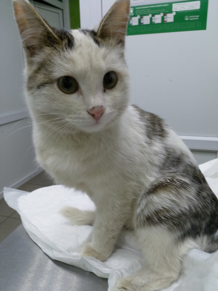 г.Пермь Сегодня в 12.30 из Нефтекамска, да, опять оттуда ((( слишком много там несчастных животных, не могу оставаться совсем спокойной к их беде. Котик Мелман (подпольная клика Серый, это первое, что мне пришло на ум, когда на кота создавали карточку)несколько недель ходил по магазину и улицам с переломом лапы. Он не мог на нее наступать и передвигался на трех лапах, а больную постоянно подгибал. Вывезти быстро не получилось, пока освободилось место в клинике, пока закрывали часть долгов, пока нашли машину, спасение затянулось. По приезду, чего и стоило ожидать, оказалось, что перелом уже застарелый и успел срастись, т.е. операцию делать поздно. Но не всё так плохо, Мелман опирается на лапу, ходит, правда видно, что был перелом, походка не как у здоровых кошек. Со временем и походка станет более четкой, лапа перестанет болеть. Ростиком Мелман с небольшую кошку, а ему 2-3 года судя по зубам, либо уличная жизнь его так потаскала, что зубы желтоватого цвета и имеется зубной камень. На в