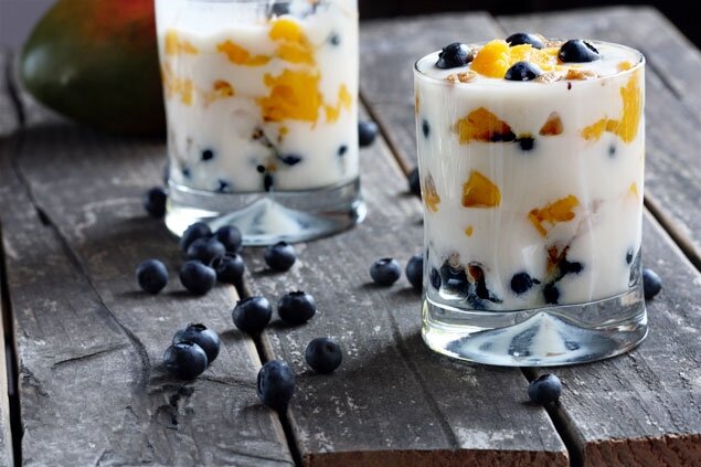 Быстрый легкий рецепт для здорового и питательного завтрака или десерта в течение летних дней. Чередование слоев красочных фруктов с йогуртом делает этот парфе из черники и манго совершенно неотразимым. Если подается с домашней гранолой, это абсолютно божественно. Лучшая часть заключается в том, что вы никогда не можете заскучать от этого, как вы всегда можете изменить фрукты. Ингредиенты Приготовления Чтобы сделать парфе, поместите слой черники на дно, мюсли затем добавить йогурт. Добавьте слой манго, мюсли, а затем снова добавьте йогурт. Повторяйте слои до тех пор, пока блюдо не наполнится. Украсить свежей голубикой, ломтиками манго и мюсли. Хранить в холодильнике до готовности к подаче. Приятного аппетита!