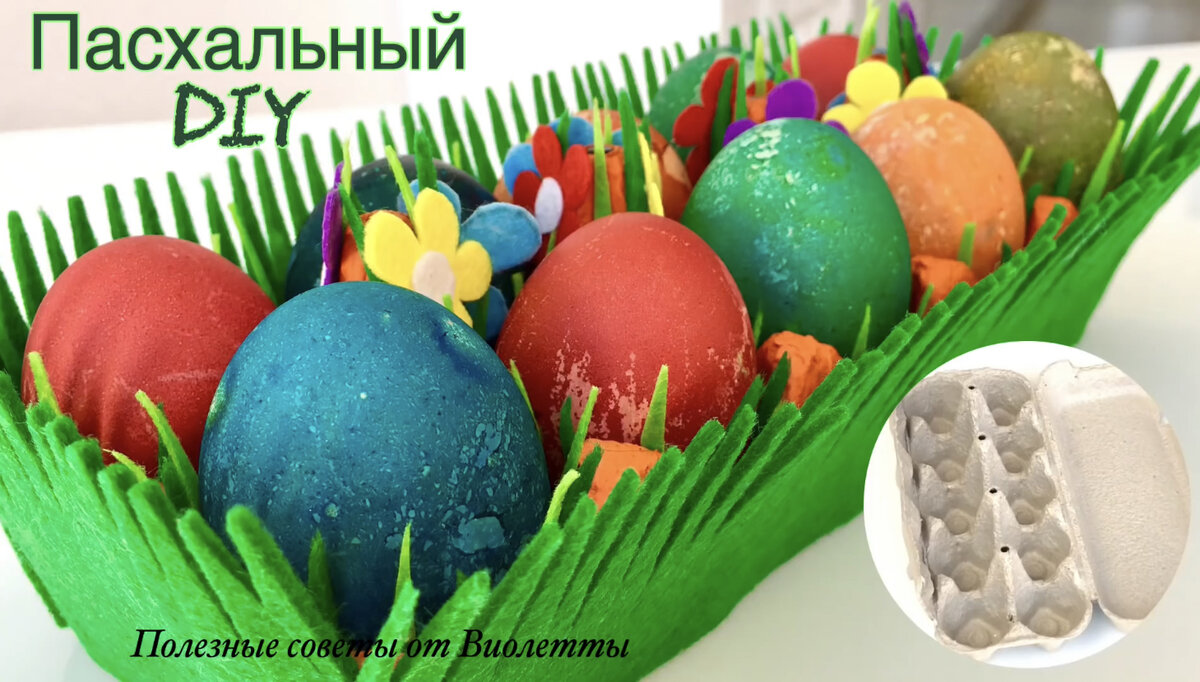 Любите красивое оформление, но хотите потратить минимум денег на него? Тогда этот декор на Пасху для вас! 1. Возьмите обычный картонный лоток из под яиц. Разрежьте его, нам потребуется только часть с ячейками для яиц. 2. В середине разукрасьте любыми акриловыми красками, я выбрала оранжевый цвет. Дайте краске немного высохнуть. 3. Вырежьте из фетра зелёного цвета прямоугольные полоски по ширине и длине коробки. Затем разрежьте полоски, чтобы получилась имитация травы. Наклейте её их коробку как показано на рисунку, используйте горячий клей или супер клей. 4. Вырежьте из разноцветного фетра небольшие цветочки и приклейте их в коробку. Поместите Пасхальные яйца в такую яркую и праздничную коробку. Я надеюсь Вам и Вашим гостям такой простой Пасхальный декор понравится! Чтобы посмотреть пошаговое видео как сделать такой декор переходите по ссылке: https://youtu.be/O1bH19XTKTI Делитесь с друзьями в соц.сетях, ставьте лайк и пишите комментарии если Вам понравилась моя идея Пасхального д
