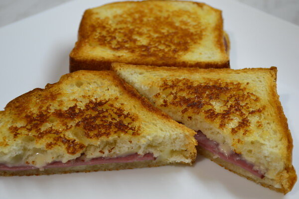 Поджаренные хрустящие тосты с любимой начинкой и тянущимся сыром - объедение! Отлично сочетаются с чашечкой кофе. ----- Нам понадобится: ----- Три кусочка тостового хлеба немного смазать сливочным маслом с одной стороны. Выложить на сковороду маслом вниз, сверху выложить ломтики сыра. Я беру тонкую нарезку. На сыр выложить любую мясную нарезку. У меня варено-копченая говядина. Можно взять ветчину, нарезанные сосиски, тонко нарезанное вареное яйцо, помидоры, зелень и т.д. Сверху выложить еще сыр. Накрыть оставшимся хлебом, немного смазать сливочным маслом. Поставить сковороду на маленький огонь, поджарить до румяной корочки с одной стороны. Аккуратно перевернуть с помощью лопатки, поджарить с другой стороны. Можно каждый тост немного прижать лопаткой, чтобы сыр лучше "прихватился". Подать горячими. Приятного аппетита! ---- Говорят, что это придумали экономные хозяйки - поджаривать начавший подсыхать хлеб. Хотя есть мнение, что тосты жарили еще в Римской империи. Также существует