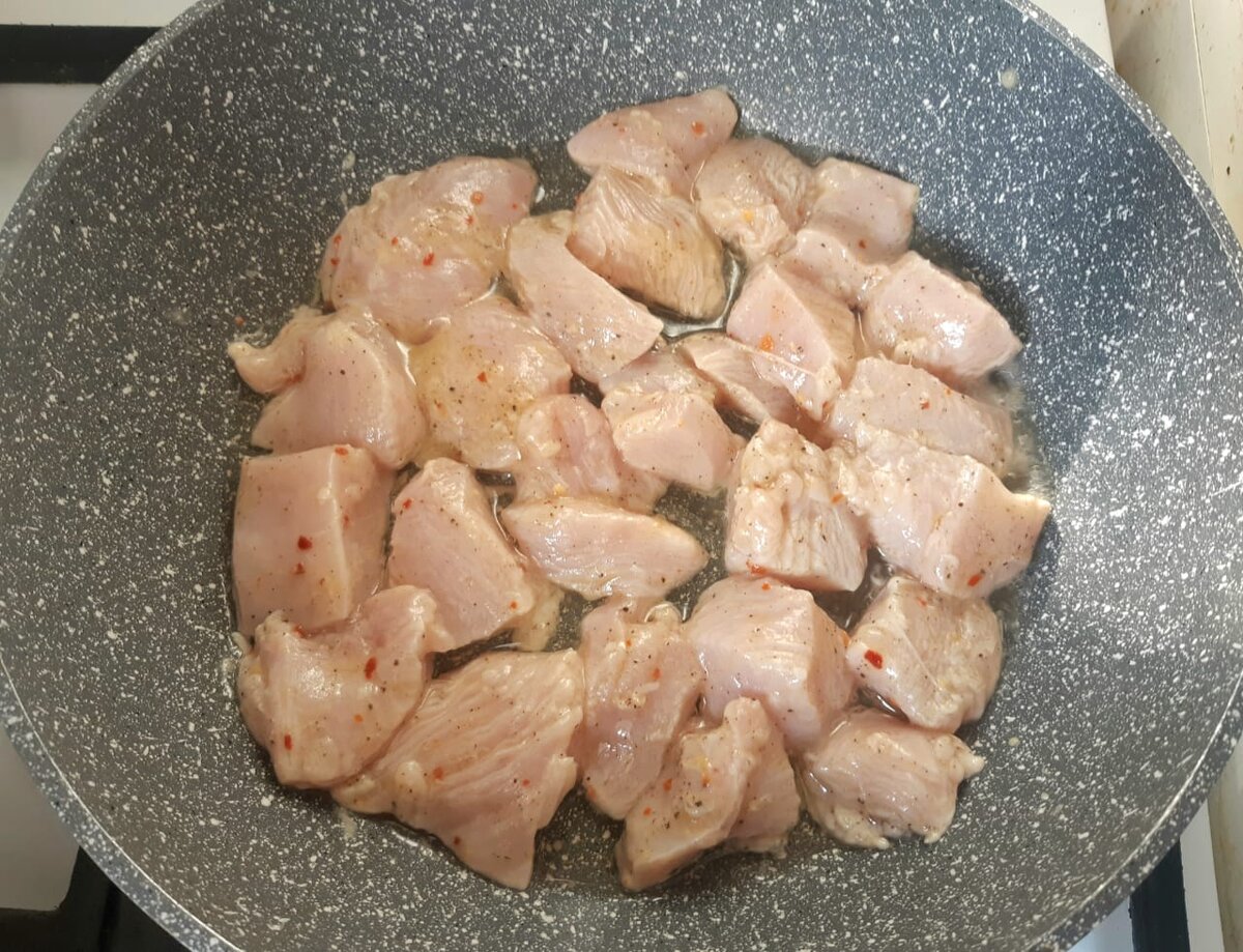 Для меня самое главное в еде - это разнообразие. Чем больше ингредиентов и вкусов - тем лучше! Поэтому больше всего я люблю, конечно, салаты. Сегодня я поделюсь рецептом одного из своих любимых салатов, который можно поставить и на праздничный стол, и просто порадовать себя в будни. Мне кажется, что курица+грибы = отличное сочетание. Я предпочитаю лесные грибы, потому что они обладают более насыщенным вкусом и ароматом. Но их всегда можно заменить на шампиньоны. Я взяла небольшую куриную грудку, нарезала кубиками и замариновала в течение часа в лимонном соке с оливковым маслом. Лимонный сок делает мясо еще нежнее, а оливковое масло помогает специям хорошенько впитаться. Хотя я на этот раз обошлась только солью, черным и красным перцем. Вообще я любитель специй, но тут они ни к чему. Вкусов и без того будет достаточно. Затем куриную грудку нужно обжарить до золотистой корочки. В морозилке у нас с лета остались замороженные лисички. Я решила, что они отлично украсят салат. Разморозила в