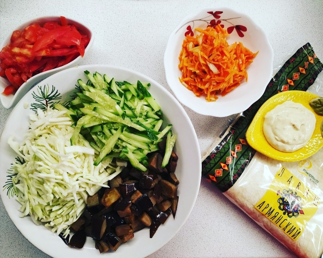 Сегодня я хочу поделиться рецептом шаурмы, которая является хорошей альтернативой классической, а самое главное не такой калорийной. Ингредиенты: Приготовление: 1.Баклажаны моем, замачиваем в соленой воде на 15-20 мин( для удаления горечи). Нарезаем на кубики и обжариваем. 2. Нарезаем соломой огурец, помидор, капусту. 3. Готовим соус: Сметану(150гр и кефир (80мл) взбиваем в блендере, добавляем специи и соль по вкусу. Должна быть консистенция густой сметаны. 4. На лаваш выкладываем нарезанные овощи. 5.Овощи поливаем соусом 6. На соус корейскую морковь, а сверху баклажан 7. Заворачиваем лаваш 8. Выкладываем на разогретый гриль или сковородку 9. Обжариваем до золотистой корочки Приятного аппетита!