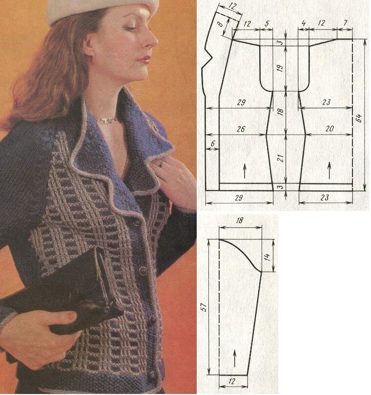 Добрый день, читатели. Снова занимаемся ручным вязанием с журналом “Вязание” за 1982 год, автор Г.Л. Матвеева. На повестке дня жакет с фигурным воротником. Для 46-48 размеров необходимо 600 г пряжи: 500 г синей и 100 г серой. Пряжа соединена в 5 нитей. Вяжем спицами № 2,5. Чулочной вязкой связаны спинка и рукава, а вот на полочках вывязана цветная клетка. Свяжем образец. Число петель должно делиться на 9 плюс 2 кромочные петли. 1-й и 2-й ряды вяжутся лицевыми петлями нитью серого цвета. 3-й и 5-й ряды нитью синего цвета: 4 лицевые петли, 1 петлю снять с нитью за спицей, 1 лицевая, 1 петлю снять с нитью за спицей, 1 лицевая, 1 петлю снять с нитью за спицей. 4-й и 6-й ряды нитью синего цвета: 1 петлю снять с нитью перед спицей, 1 изнаночная, 1 петлю снять с нитью перед спицей, 1 изнаночная, 1 петлю снять с нитью перед спицей, 4 изнаночные. С 7 ряда рисунок повторите. Воротник, полочки и низ рукава отделаны шнуром серого цвета. Для вязания шнура наберите 3 петли. 1-й ряд: снимаем перву