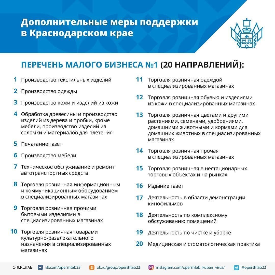 Постановление главы Кубани предусматривает продление для бизнеса в 2020 году сроков уплаты региональных, местных налогов и налогов, предусмотренных специальными налоговыми режимами. Эти меры поддержки получат организации и индивидуальные предприниматели, чей вид деятельности включен в перечень 26 наиболее пострадавших из-за введения режима повышенной готовности в крае.⠀