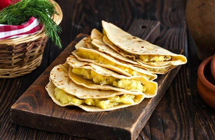 3. Для начинки очистите картофель, сварите в подсоленной кипящей воде до мягкости, 20-30 мин. Слейте воду, растолките картофель в пюре, приправьте укропом. Лук очистите, мелко нарежьте и обжарьте в 3 ст. л. масла на среднем огне 10-15 мин., до золотистого цвета. Смешайте лук с картофельным пюре.