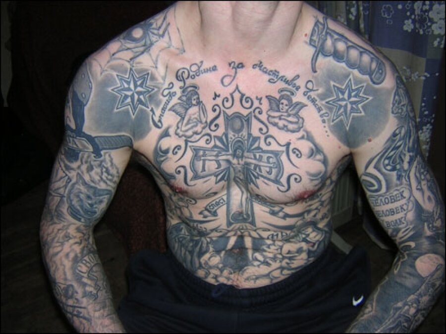 Это татуировка знаком, что заключенный считает себя похожим на Иисуса Христа и их жизненные истории очень схожи. Но есть ещё одна версия и трактуется она так, что заключенный пытается очиститься от грехов и быть ближе к Богу.