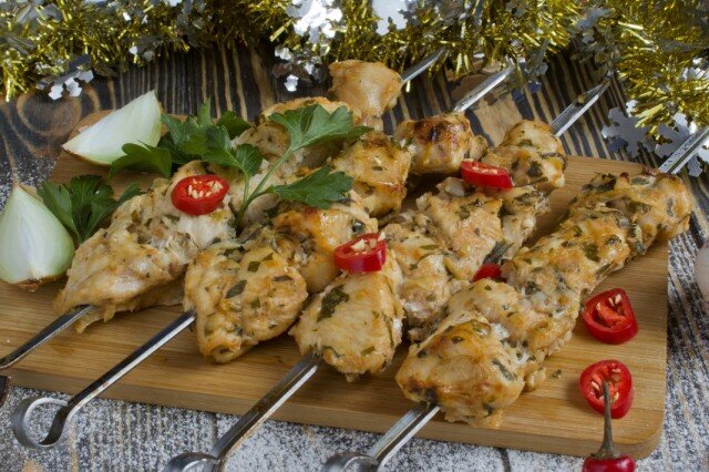 Это блюдо готовится очень просто. Кусочки куриного филе, запечённые на шпажках (или на небольших шампурах) в духовке, получаются, благодаря интересному маринаду, очень вкусными, сочными и аппетитными. Такой шашлык можно подать и в будни, и в праздники.