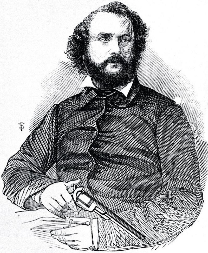 Узнал этого сурового дядьку с бородой и револьвером рядом? Это Сэмюэл Кольт американский оружейник 19 века и основатель компании которая работает и сегодня Colt's Patent Fire-Arms Manufacturing Company (сейчас Colt’s Manufacturing Company). В юности Сэмюэл был вспыльчивым . Как только ему исполнилось 16 лет, отец отправил его на морскую службу. По пути в Индию у юноши было много времени подумать. В планах у Кольта младшего не было работы на отца. Корабль сделал остановку в Лондоне. В это же время в крепости, стоящей на северном берегу Темзы , проходила оружейная выставка. Внимание юноши привлекли многозарядные виды оружия. На корабле Кольт смастерил модель пистолета с вращающимся барабаном. Склонность к изобретениям у юнца проявилась ещё в 14 лет, когда тот смастерил водную мину, при показе которой окатил всех местных с ног до головы водой из озера, на котором и происходила презентация. Вернувшись из Индии домой Сэм занялся воплощением своей идеи в проект, на который у него н