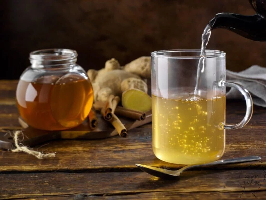 1 ч. л. корицы, заваренная в 3-х стаканах воды и охлажденная + 4 ст. л. меда. Пить 1/4 чашки 3 - 4 раза в день. Сохраняет кожу свежей и мягкой и задерживает старение.