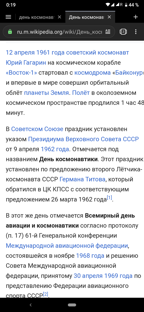 И даже, говорят, еврейская Пасха сегодня? Автор Сергей. Сохранены авторский стиль и орфография. Привет ) Поздравляю с Днем космонавтики! 12 арреля 1961 г Юрий Гагарин ,советский летчик-космонавт совершил первый в мире космический полет на космическом корабле Восток-1. Полет продлился недолго,всего 1час 48 минут. Вернее ,целый час и сорок восемь минут. Он был первый. -- Несовершенство техники ,множество нерешенных задач ,являлись серьезной помехой ,но были с успехом преодолены. Первенство Гагарина неутомимо оспаривают американцы ,придумали сказочку о полете своего космонавта в мае того же года ,вымарывают надпись "СССР" на шлеме нашего космонавта ,измышляют "веские доводы и аргументы" . Чушь , СССР ,Гагарин были первыми и точка .Давайте с уважением относиться к своей истории и не поволять искажать ее всякого рода безродным космополитам ,в угоду заокеанским заказчикам. С Днем космонавтики!Ваш Сергей Главред рекомендует посмотреть всей семьей "Время первых"или "Салют-7" или документалку