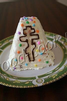 Готовую пасху опрокинуть на блюдо, форму и ткань снять.