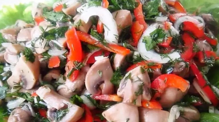 Фишка салата – это вкуснейший маринад, который придает салату особую пикантность и свежие овощи с грибами, получаются очень вкусными. По вкусу можете увеличивать количество продуктов. Для приготовления вам потребуются такие ингредиенты: — вешенки или шампиньоны, 500 г; — перец сладкий, лук, по 1 шт; — укроп и прочая зелень, по пучку; — чеснок, 2 – 3 зубчика; — сахар и соль, по 1 ч.л; — масло растительное, 5 ст.л; — уксус 9 %, 2 ч.л; — вода, 1 л и соль, 2.5 ст.л для грибов. Процесс приготовления Вам также нужны листья салата для декора салата. Грибочки режем на части – не маленькие и не крупные. Грибы заливаем водой и добавляем соль, варим 10 минут после закипания. Перец режем тонкой соломкой, лук – тонкими полукольцами, зелень – мелко рубим. Смешиваем овощи с измельченным чесноком, сахаром и солью, уксусом, растительным маслом. Остывшие грибы избавляем от излишков жидкости, выложив их на бумажные полотенца и смешиваем с салатом. Емкость с салатом накрываем крышкой и ставим в холодильни