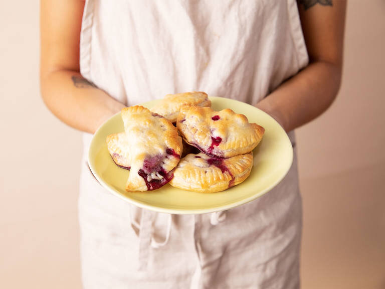 Ингредиенты Порции: 6 1 лист слоеного теста 75 г черники 4 ст. л. сахарной пудры 2 ст. л. воды Шаг 1/2 1 лист слоеного теста-75 г черники Разогрейте духовку до 210°C/410°F. вырежьте кружочки из размороженного слоеного теста с помощью круглой формочки для печенья. Положите свежую чернику на каждый круг и сложите пополам. Прижмите края вместе с вилкой, чтобы запечатать, и ткните один или два раза сверху, чтобы сделать небольшие отверстия для выхода пара. Переложите на противень и выпекайте в течение 10 минут или до золотистого цвета. Шаг 2/2 4 ст. л. сахарной пудры-2 ст. л. воды Взбейте вместе сахарную пудру и воду, чтобы получилась легкая глазурь. Аккуратно смажьте кисточкой теплые пироги и немедленно подавайте к столу. Наслаждайтесь!