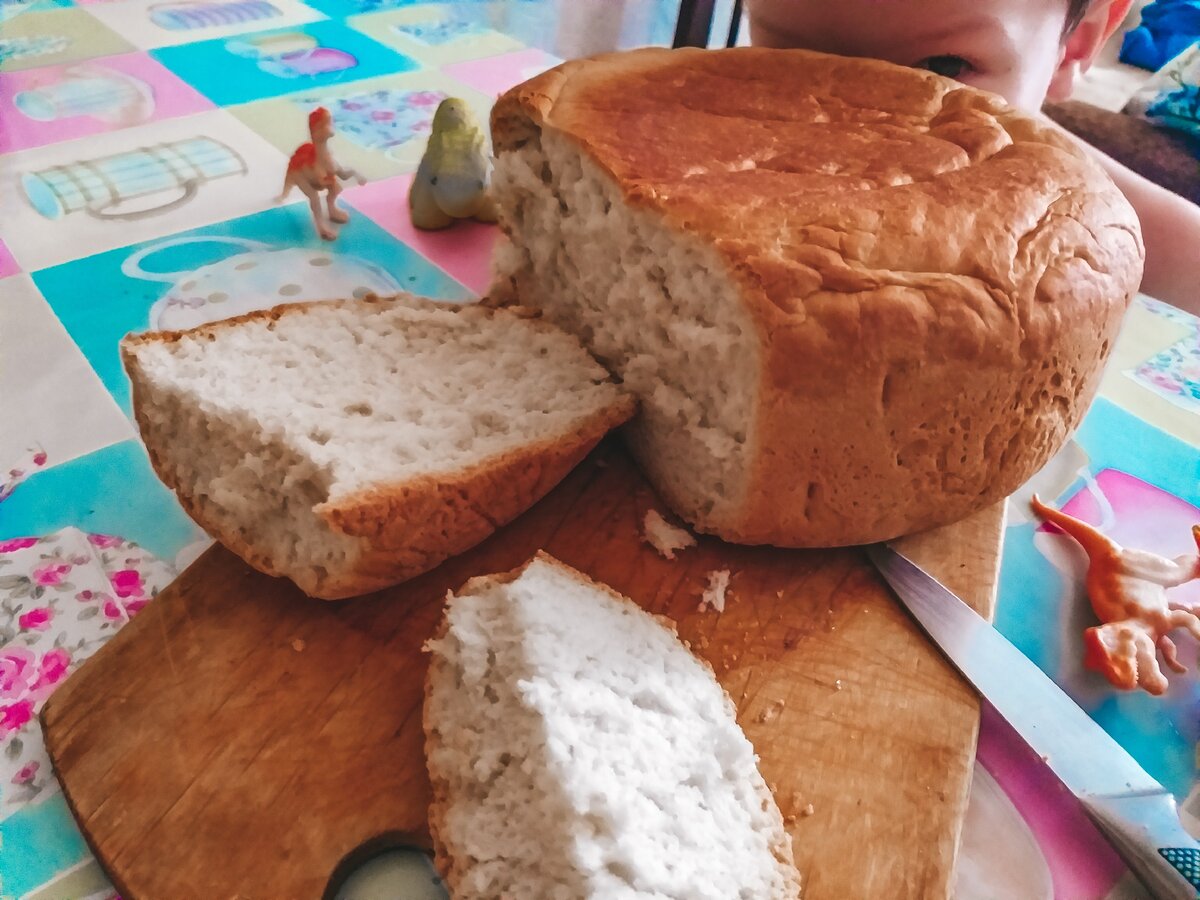 Белый хлеб в мультиварке ⠀ ⠀ Ингредиенты:⠀ ⠀Мука пшеничная (высший сорт) - 660 гр.⠀ ⠀Сахар - 25 гр.⠀ ⠀Дрожжи (сухие) - 15 гр.⠀ ⠀Соль - 10 гр.⠀ ⠀Масло растительное - 30 мл.⠀ ⠀Вода - 270 мл. потом добавила еще ~100 мл⠀ ⠀ В отдельной емкости смешать муку, соль, сахар и дрожжи. Продолжая помешивать, тонкой струйкой влить воду и растительное масло (20 мл). Вымешивать тесто до тех пор, пока оно не начнет отставать от стенок емкости. Чашу мультиварки смазать растительным маслом (10 мл), выложить тесто и разровнять. Закрыть крышку. Установить программу ХЛЕБ, время приготовления 3 часа. Нажать кнопку «Старт». За 1 час до завершения приготовления открыть крышку, перевернуть хлеб, закрыть крышку. Готовить до окончания программы. Готовый #хлеб вынуть из чаши и дать ему остыть в течение 30 минут.⠀