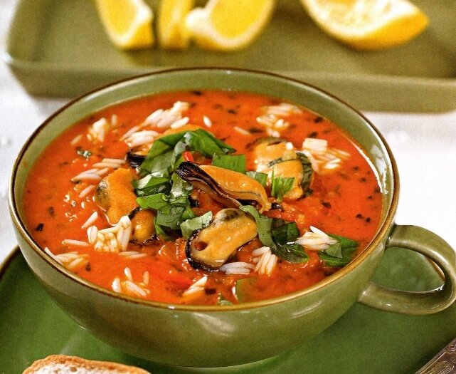 Весенний рацион требует особого внимания, пришло время снижения калорий, и насыщения блюд витаминами, овощами. Экзотическое первое блюдо, рецепт, которого дается ниже, обязательно понравится родным и близким, и станет одним из любимых. Для приготовления супа понадобятся следующие продукты: Овощи моют, лук чистят и нарезают кубиками, кишмиш тщательно моют, и ошпаривают кипящей водой. Помидоры опускают в кипяток (на 5-10 секунд), обдают холодной водой, затем снимают кожицу. Вырезают несъедобные серединки, затем помидоры мелко режут. Суп готовят пошагово: Готовый суп ИЗ МОЛЛЮСКОВ И РИСА должен настояться 20-30 мин. Блюдо подают в порционной суповой тарелке, к нему отлично подойдет хлеб с семенами кунжута и белое вино. Приятного аппетита. Вам может быть интересно: