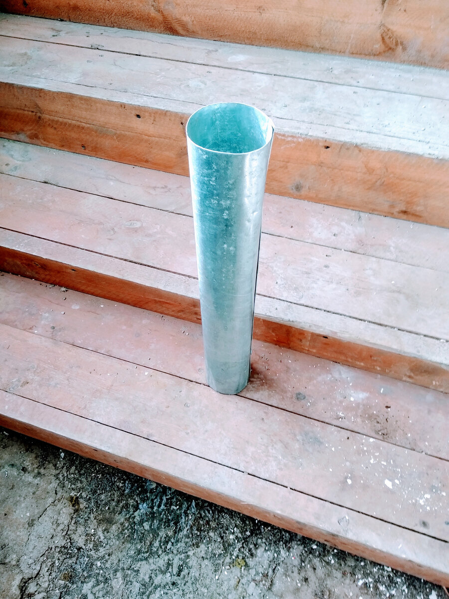 Вырезаем ножницами по металлу лист нужного размера. Отступаем с одной стороны 10мм. и рисуем линию. По этой линии отгибаем кромку на угол 90 градусов. Я отгибал на металлическом уголке деревянной киянкой. Если трубы должны будит вставляться одна в другую, то одну сторону заготовки нужно делать шире на 10мм. Подложив уголок, сваливаем кромку на плоскость. Получился замок. Второй замок должен быть с другой стороны. Загибаем лист вокруг металлической трубы, соединяем замки и тщательно пробиваем получившийся шов молотком. Здесь надо внимательно следить, чтобы стуча по одной стороне, другая не разошлась. Труба готова, делал первый раз, так что сильно не ругайтесь. . На всякий случай закрутил в шов еще пару саморезов.