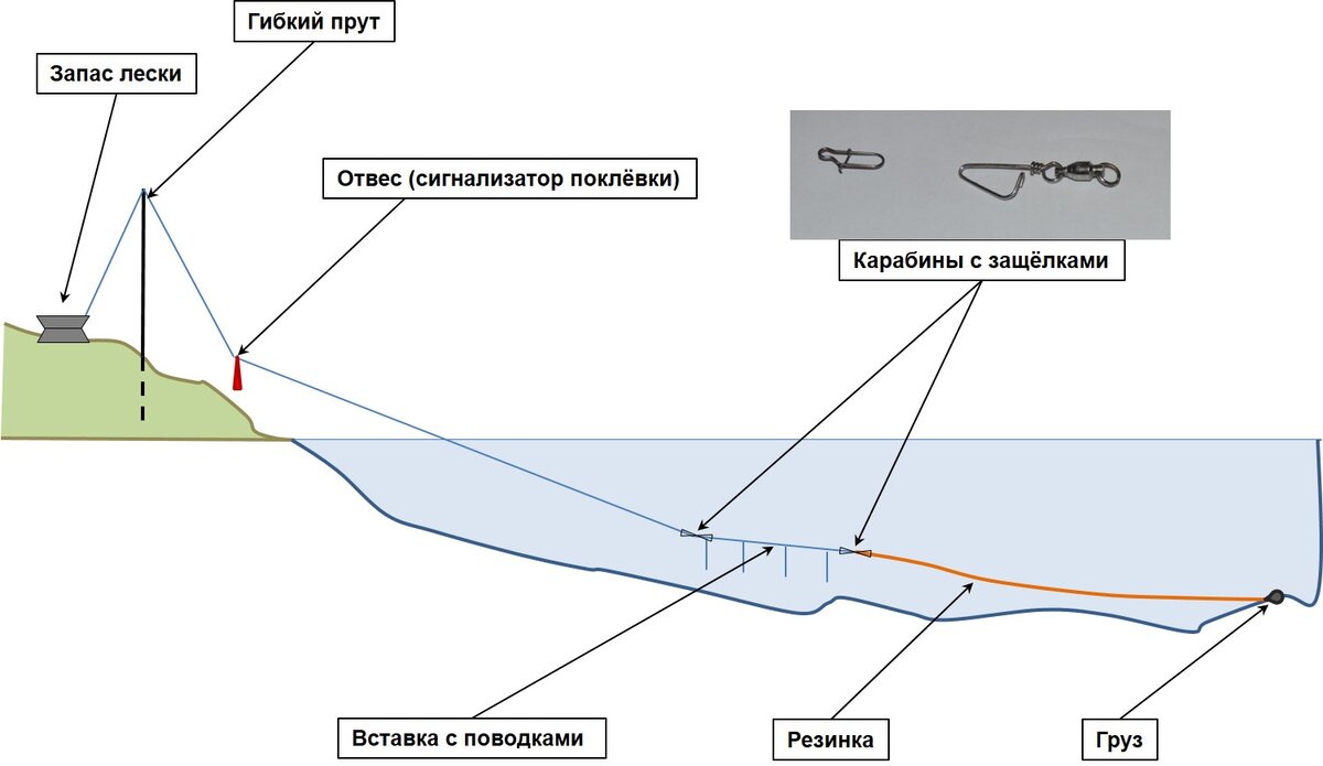 О вариантах ловли на резинку я уже рассказывал на своём канале. Сегодня поведаю об устройстве для прикармливания рыбы. Речь идёт о карповых породах и прочей "мирной рыбе". Система весьма простая и надёжная, но имеет несколько важных моментов, на которые следует обратить внимание. Для кормушки применяется или пластиковый контейнер или металлическая жестяная банка из-под сельди: Сразу же поясню - этот контейнер-кормушка съёмный. И крепится к снасти в районе соединения резинки и лески посредством поводка с защёлкой: На снимке зелёная точка соответствует точке крепления к кормушке поводка из лески длиной 25-30 см. Если прикрепить поводок в районе красной точки или к борту контейнера, то он попросту перевернётся, не дойдя до точки кормления, тем более, если присутствует рябь на поверхности воды. Если местом крепления выбрать центр контейнера, то Вам не удастся перевернуть контейнер, чтобы высыпать в нужном месте прикормку. В контейнер-кормушку помещается прикормка, цепляется поводок защёлк