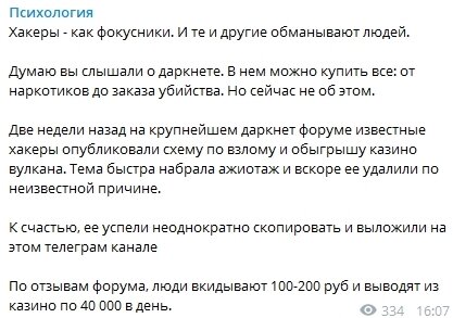 Какой-нибудь беглый работник казино, гениальный хакер или студент — первооткрыватель с большим и добрым сердцем готов бесплатно поделиться выигрышными комбинациями в канале. Кстати каналы все на одно лицо, представлены стратегии игры и горы отзывов, естественно фейки. Про схемы выигрыша в казино я уже писал, при любом итоге вам ничего не дадут вывести из казино, вы только сольете деньги. Админы таких каналов п