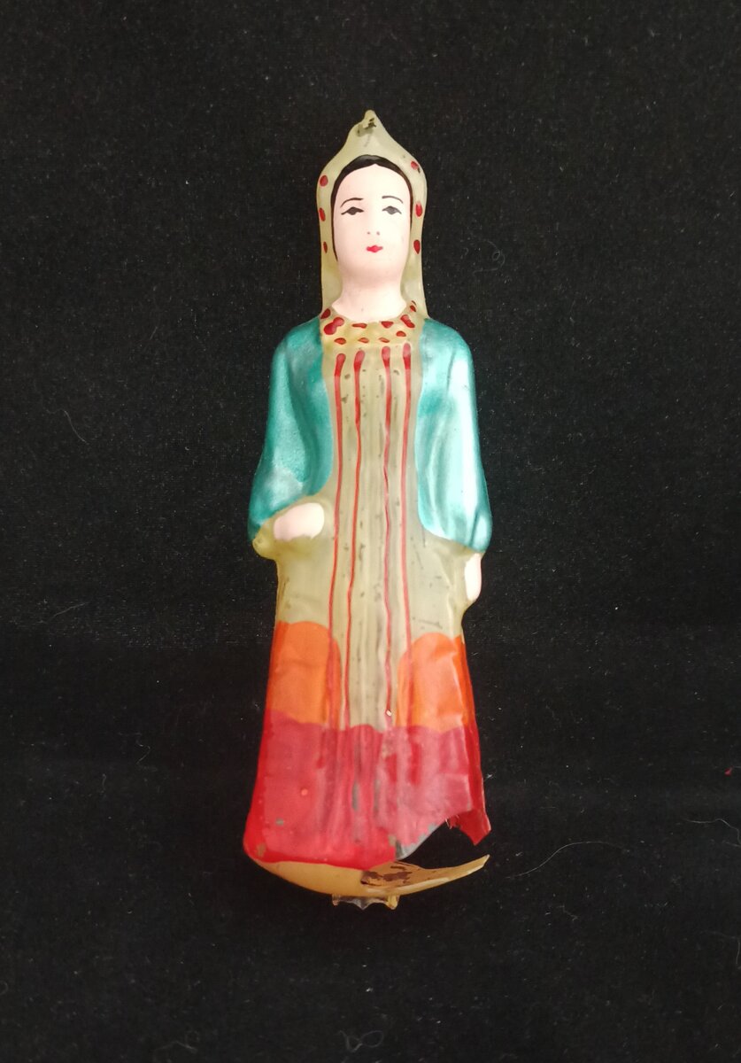 Золотинка (сказки Бажова, 1958г, худ.Борисова Е.Е.). Раньше думали, что это Хозяйка медной горы, но в новом каталоге это - Золотинка. Она бывает в двух вариантах росписи и чаще встречалась мне в амальгаме, но мне или не нравилось, как они выглядят или было дорого. На страницах каталога я давно приглядела себе Золотинку именно в краске, очень она мне понравилась и цветом и внешне. И вот недавно купила такую под реставрацию и что самое приятное - с очень милым и хорошо сохранившимся личиком. Правда, досталась она мне с очень большими повреждениями. Показываю: Весь низ был практически отбит, трубочки на было, от подола шла большая трещина до руки. Для понимания масштаба бедствия фото сделала и снизу. Очень долго я решалась на эту реставрацию. Очень боялась испортить. Я ходила вокруг нее кругами, брала в руки и применялась, как я буду ее делать. Представляла по шагам. И вот наконец-то решилась. Первым делом укрепила лицо, чтобы краска не слетела. Потом принялась за трещину от подола до