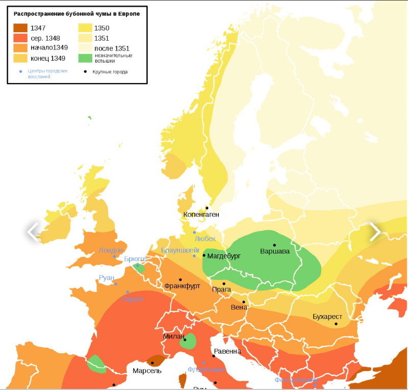 Пандемия чумы началась примерно в 1320 году в пустыне Гоби, между Монголией и Китаем - из-за того, что монголы ели мясо сурков, зараженных какими-то своими заморочками. Первый очаг пандемии - провинция Хэбэй в Китае, где умерло до 90% населения. Колыбель короновируса Ухань находится в тех же краях. Пандемией были серьезно затронуты Индия и Египет. Одним из пострадавших во время чумы районов стали окрестности озера Иссык-Куль, находящимся на территории современного Казахстана. Через Золотую Орду чума добралась до Крыма, а в Европу ее привели генуэзские корабли. Как и сегодня, Италия стала одной из стран, наиболее сильно затронутых пандемией. Оттуда болезнь перекинулась во Францию и Испанию, а через южные воды Средиземного моря достигла Сирии и выкосила Аравийский полуостров. Перепуганные правоверные бросились спасаться в Мекку, спровоцировав там вспышку чумы грандиозной силы. Во Франции и Испании болезнь, помимо простого люда, коснулась и весьма знатных особ, затем пересекла Ла-Манш