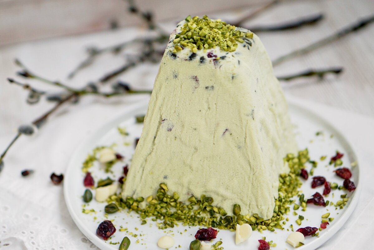 - 0, 5 пакетика ванильного сахара. Свежий творог пропустить через сито или измельчить блендером, добавить мелко истолченный с ванилью сахар и хорошо растереть. Добавить яйца, сливочное масло комнатной температуры, мелко изрубленные фисташки. Все растереть как можно лучше и добавить взбитые сливки, ещё раз перемешав. Выкладываем в пасочницу, проложенную чуть влажной мар