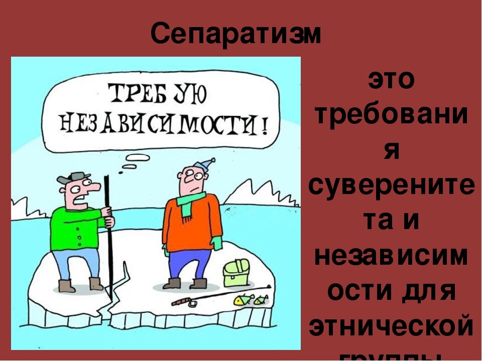 Я имею ввиду не право на свой язык и культуру , религию. Этио право не подлежит сомнению. речь идет именно о праве на отделение и создание собственного государства. Как ? Столько государств распалось и столько государств разовалось путем отделения от империй ? Разумеется. Но я то говорю именно о праве. То, что один этнос может отделиться от другого и образовать собственное государство в результате противостояния элит, революции, гражданской войны я не отрицаю. Но это результат политической борьбы и еще ничего не говорит о ПРАВЕ. Что до меня, так это право, то биш "право на отделение" весьма сомнительно. И противоречит другим правам, например праву государства на территориальную целостность. А еще, врезультате осуществления этого права, как правило начинается вооруженный конфликт, этнические чистки, выселение целых нарродов и т.п. Короче говоря: гражданская война и все ее прелести. И как результат - апофеоз апофигей: отделение совершилось и создано наконец независимое госуда