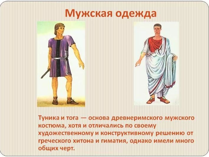 Сохранившиеся записи и изображения показывают римлян в белых или цветных кусках ткани - тогах и туниках. Интересно, а зимой они что доставали из шкафов? Унты или тогу из меха? Хлопка в те времена мало встречалось, поэтому все ткани производились из льна или шерсти. Кстати, шерстяную одежду римляне часто не вязали, как мы сейчас (свитера, варежки, шапки, носки, шарфы), а делали из тончайших ниточек не менее тонкое полотно.