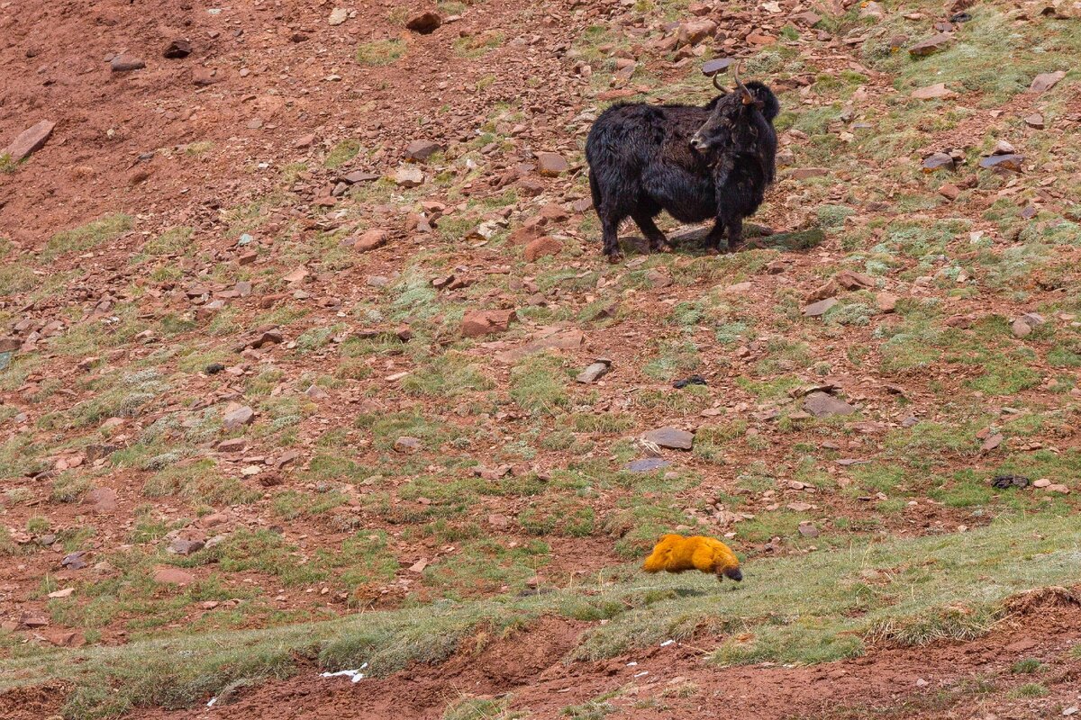 И вот за очередным поворотом, из белой пелены возникают силуэты загадочных животных. Яки, словно горные духи, спокойно пасущиеся не смотря на непогоду, добавляют мистические нотки в увиденную картину.