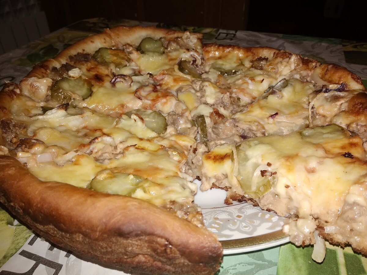 Обожаю этот рецепт домашней пиццы. Рецепт простой, а пицца получается очень нежной и просто невероятно вкусной - нравится и взрослым и детям. Ингредиенты: Мука - 300 гр. Вода - 250 мл. Дрожжи сухие - пакетик Сахар - 2 ч.ложки Соль - по вкусу Растительное масло - 4-5 ст.ложки Майонез - 2 ст.ложки Кетчуп - 4 ст.ложки Мясной фарш (в зависимости от предпочтений говяжий или свиной) - 300 гр. Огурцы маринованные - 2 шт. Сыр - 200 гр. Лук репчатый - 3-4 средних луковицы Приготовление: Готовим тесто. Дрожжи растворяем в теплой воде. Добавляем сахар, щепотку соли и высыпаем муку. Замешиваем тесто, накрываем миску полотенцем и даем подняться. Фарш обжариваем на сковороде. Можно добавить мелко нарезанный репчатый лук. Тесто немного поднялось. Обминаем. Раскатываем на столе, посыпая мукой, чтобы не прилипало к рукам и скалке. Я люблю готовить тесто для пиццы по-разному: и тонким и толстым. В этот раз тесто будет толстым и нежным. Для соуса смешиваем майонез и кетчуп (домашний). Половиной п