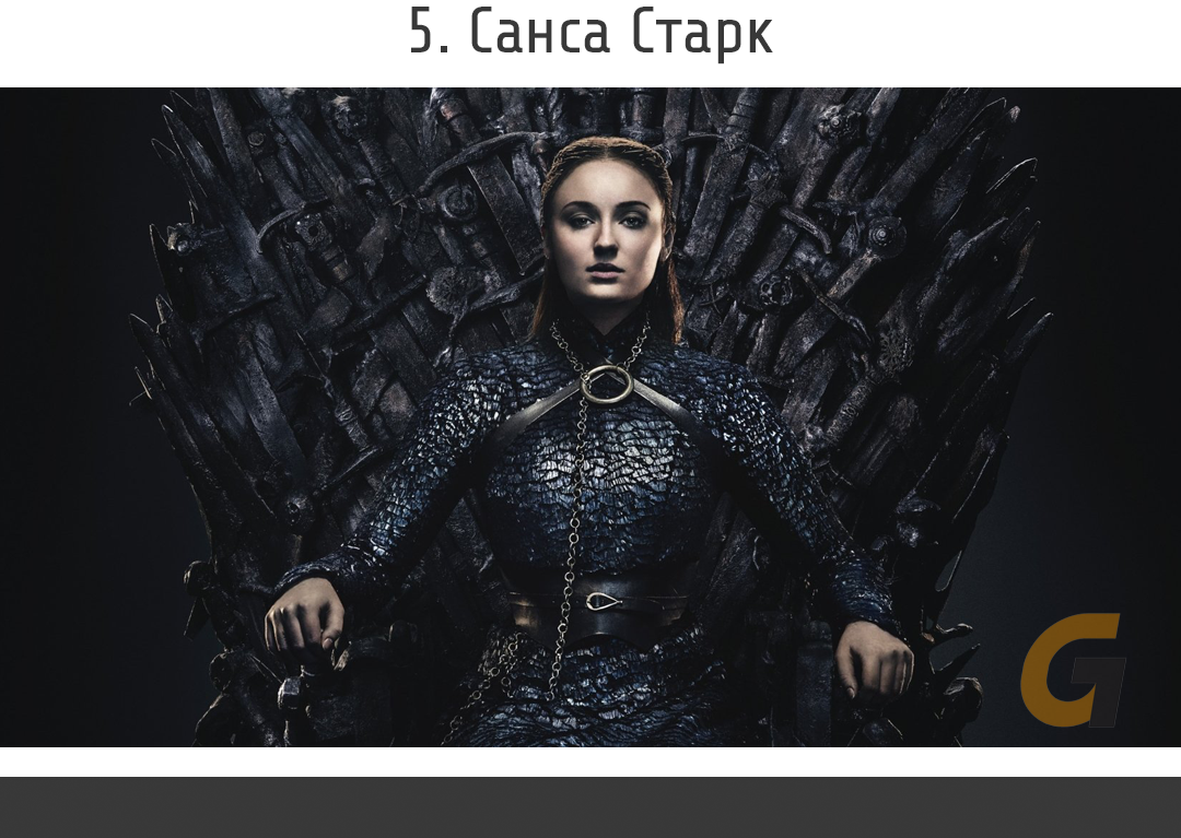 Открывает наш топ многими не любимая старшая дочь Эддарда Старка — Санса. C самого первого сезона мы убедились, что мозги у неё точно есть. Оказавшись в политическом плену у Ланнистеров, она несмотря на все унижения и угрозы создавала вид сторонника короны, любящего и уважающего Джоффри. Со временем она начала учиться у Мизинца.