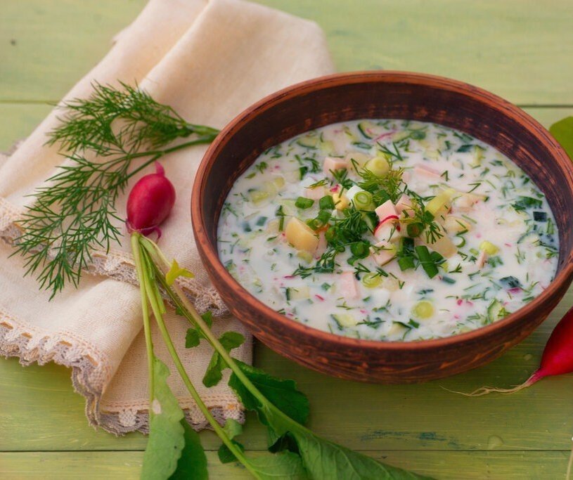 Ингредиенты: Кефир — 500 мл Газированная или минеральная вода — 500 мл Картофель — 2 шт. Огурцы — 2–3 шт. Редиска — 150 г Яйца — 3 шт. Колбаса вареная — 200 г Зеленый лук — 0,5 пучка Укроп — 0,5 пучка Соль — по вкусу Свежемолотый перец — по вкусу Приготовление: 1. Картофель отвариваем в мундире, даем остыть и очищаем от кожицы. Нарезаем картофель кубиками и перекладываем в большую миску или кастрюлю. 2. Ветчину или вареную колбасу тоже нарезаем кубиками. Вместо ветчины можно взять сервелат. Можно взять курицу, телятину, свинину, в принципе подходит практически любое мясо. Перекладываем колбасу в миску к картофелю. 3. Половину огурцов нарезаем мелким кубиком, можно предварительно очистить от кожицы. А оставшуюся половину натираем на терке. Таким образом, мы получаем хорошую, приятную консистенцию и густоту окрошки, и дополнительную сочность, и нежность. Перекладываем огурцы в миску. 4. Редиску натираем на крупной терке. Редиски можно взять побольше, она придает