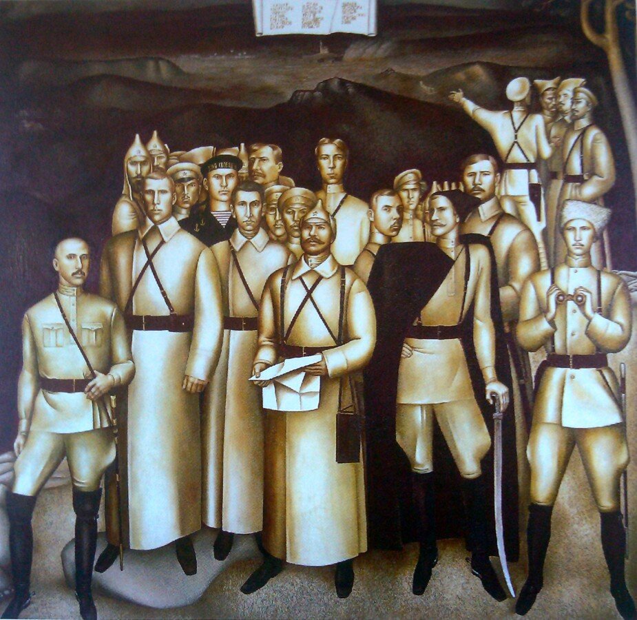 1969 год. На областной выставке в Свердловской картиной галерее впервые экспонируется полотно «Красные командиры времен Гражданской войны на Урале». На нем в полный рост тесной шеренгой предстояли военные начальники Красной Армии: Чапаев, Фурманов, Хохряков, Блюхер и другие менее известные, и совсем забытые. У меня перехватило дыхание от чувства трагизма. Статичность композиции превращала картину в стелу. Не стояние, некое парение над землей и желто-зеленый колорит сближали полотно с иконной живописью. Поражало, как много вместило одно живописное произведение. Дух эпохи, уральские просторы, зарницы боев, и, важнейшее – преклонение перед личностями, окутанных легендами. С противоречивыми чувствами я всматривалась в их бесстрастные лица. О деяниях и судьбах многих стало известно по новым публикациям, опровергавшие параграфы в моих школьных учебниках пятидесятых годов прошлого века. Но в сознание целого поколения прочно вошли искаженная история и героизация биографий ее участников. Зрители смотрели молча. Картина никого не отпускала. Там в потусторонней тишине, казалось, звучал реквием. Музыка обволакивала. Внезапно в моей душе возник неописуемый восторг, как будто я имею непосредственное отношение к созданию этого шедевра.
